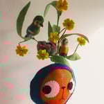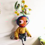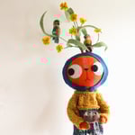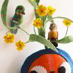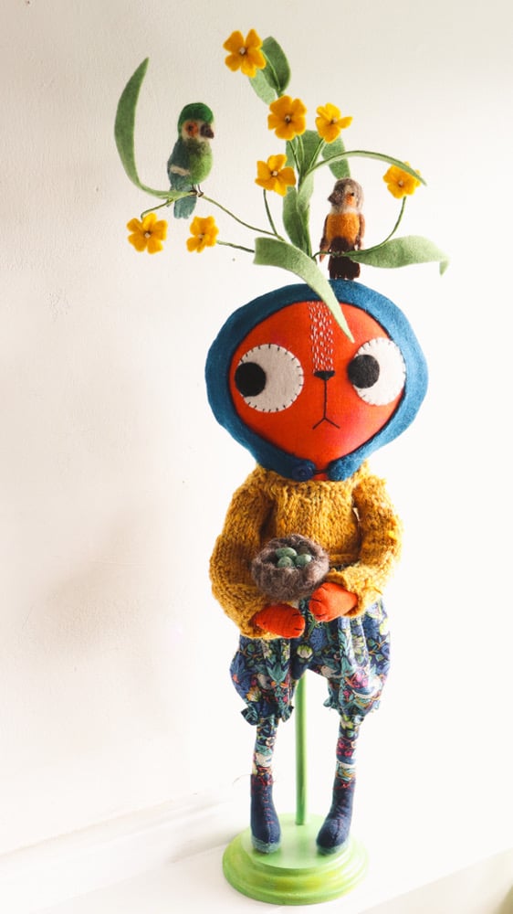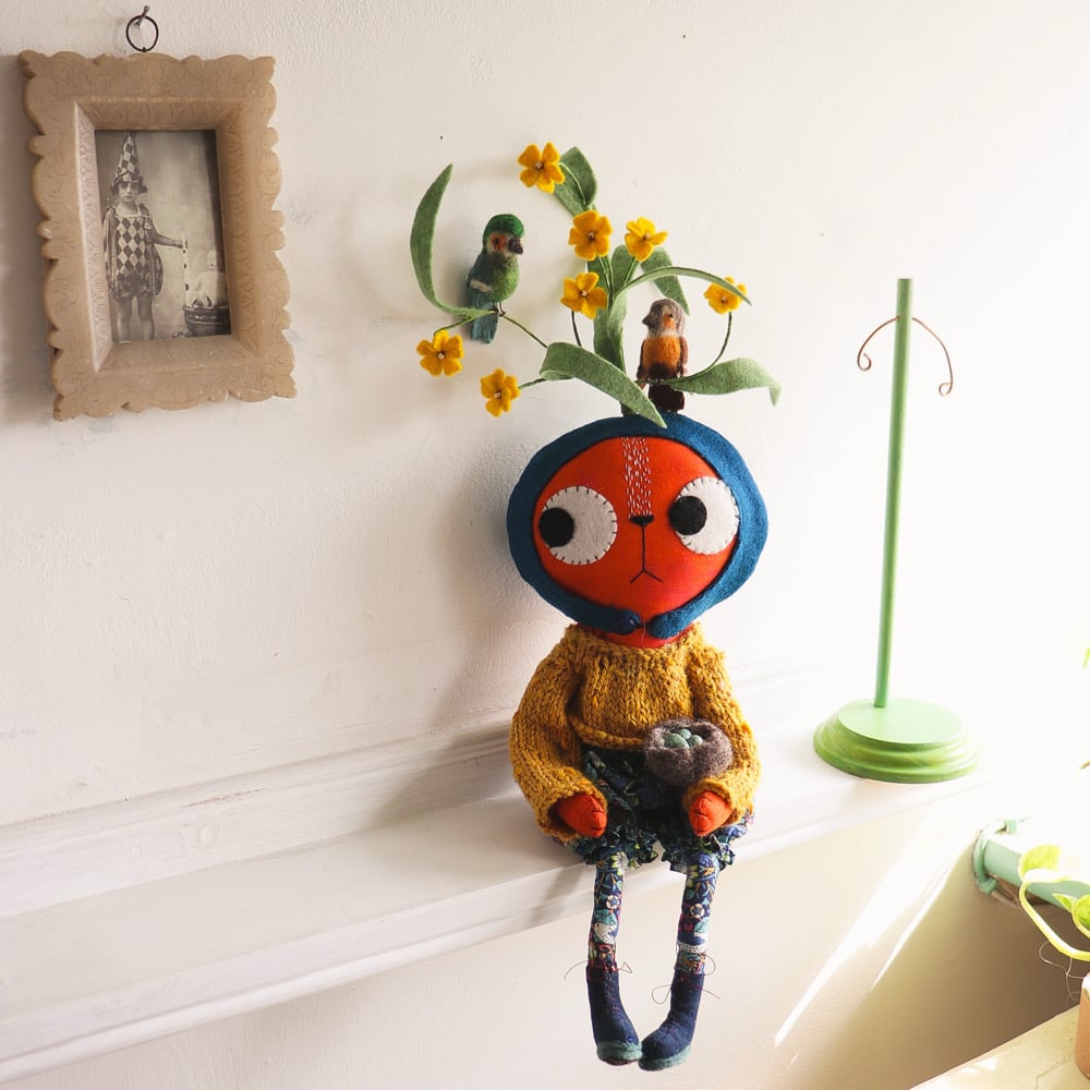 Edda Larkin has a little wool felted nest with three little hand painted clay eggs inside. Edda likes to keep the nest safe in her arms, but it can be carefully placed in the plant or by her side.