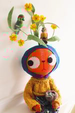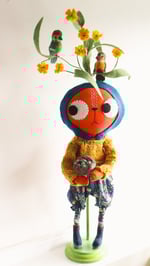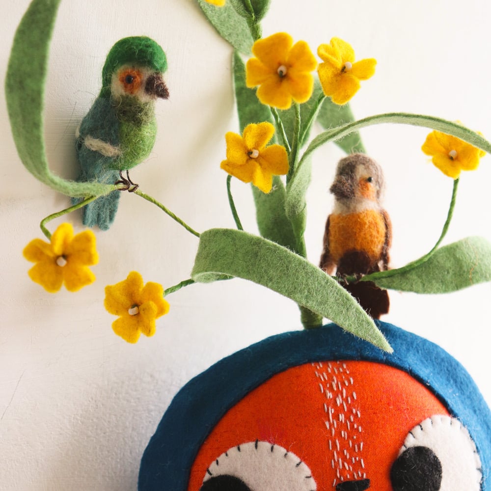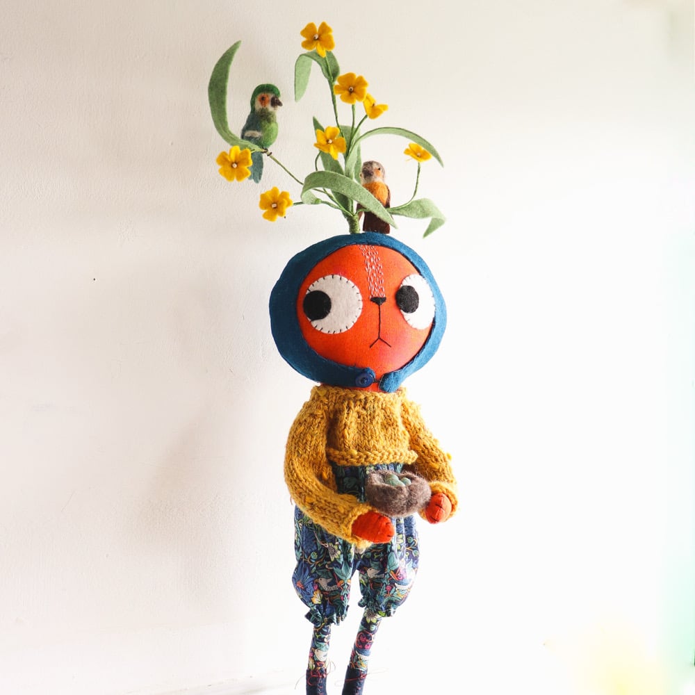 This kitty has a wool-felt hat in dark teal. It is blanket-stitched by hand and fastened with a vintage button and a little shirring elastic. A delicately handcrafted little plant with yellow flowers, made from wire and paper and wool felt appear to grow out of the hat. The flowering plant has little needle-felted birds roosting in its branches. The plant is wired and can be posed gently.