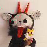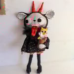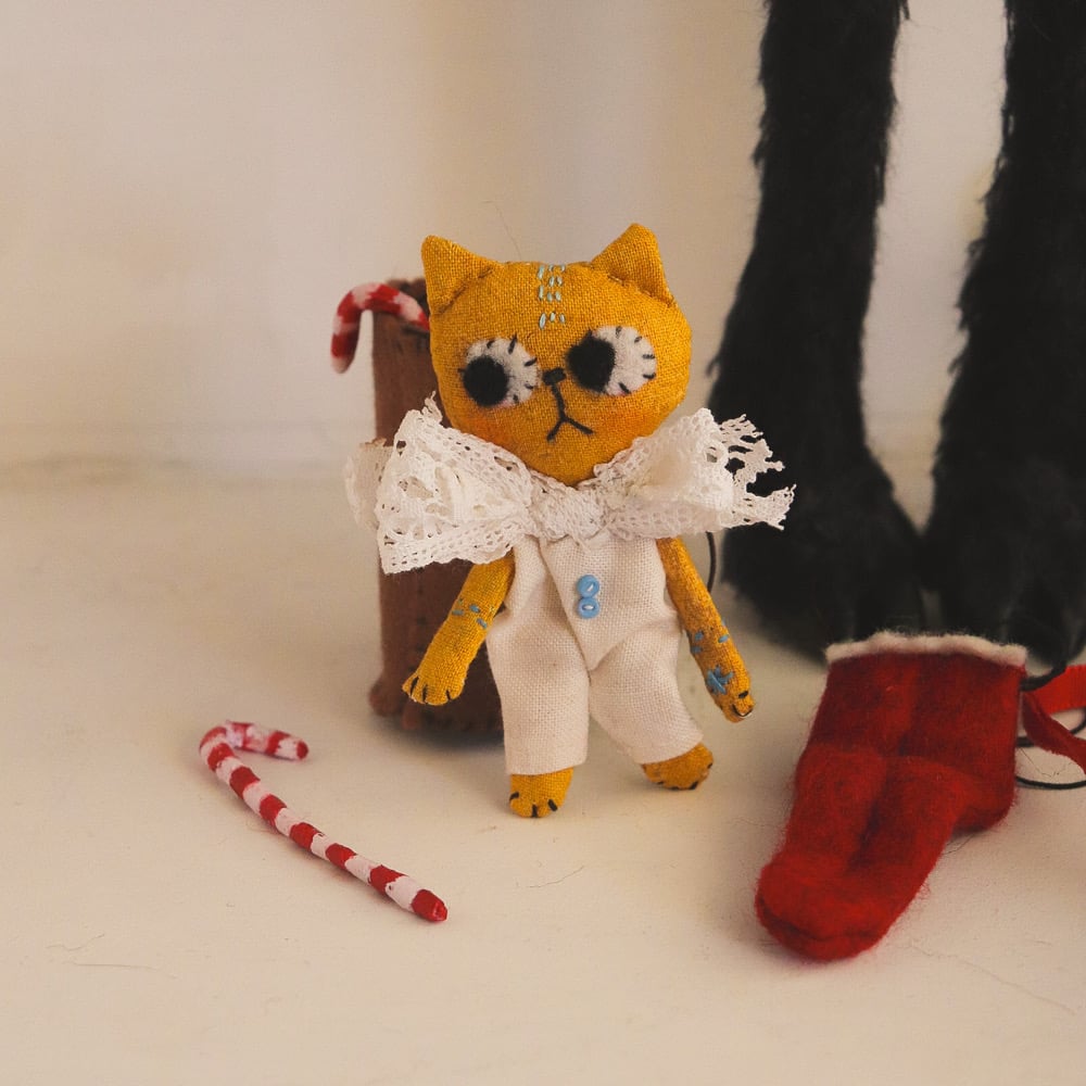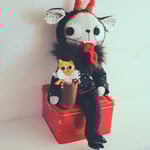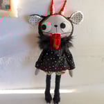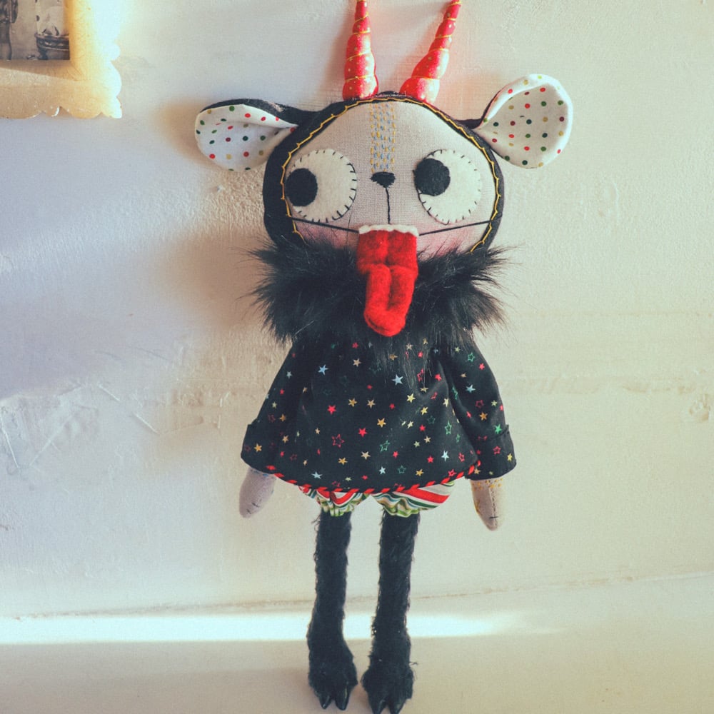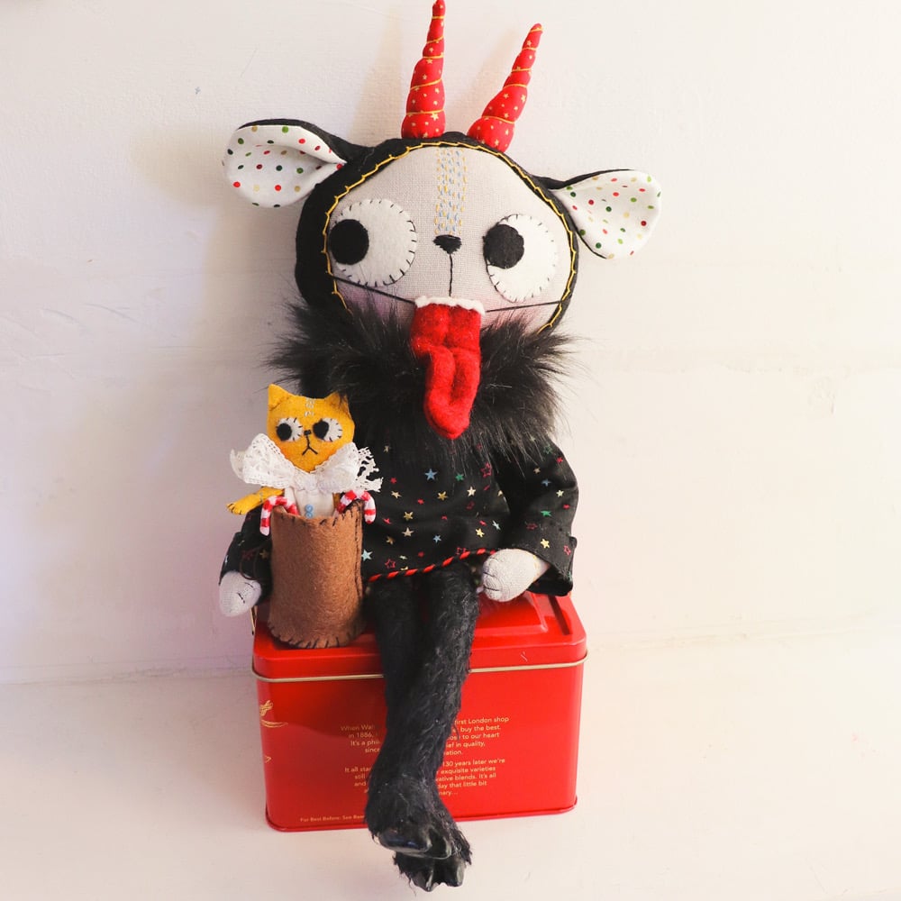 Krampuss is a grey kitty made from Essex linen, with hand-embroidered details and button-jointed arms. He wears a Quilters cotton blouse and bloomers. Krampus also wears a hat with long ears and horns, made from cotton and wool felt. His legs are made from teddy bear fur. He has hooves made from polymer clay, tissue paper, gouache and varnish. The horns are wired and can be posed. The fabrics used for his clothes and horns have gold metallic embellishments. Krampuss has a wool felt tongue witch attaches with elastic. the tongue is wired and can be posed.