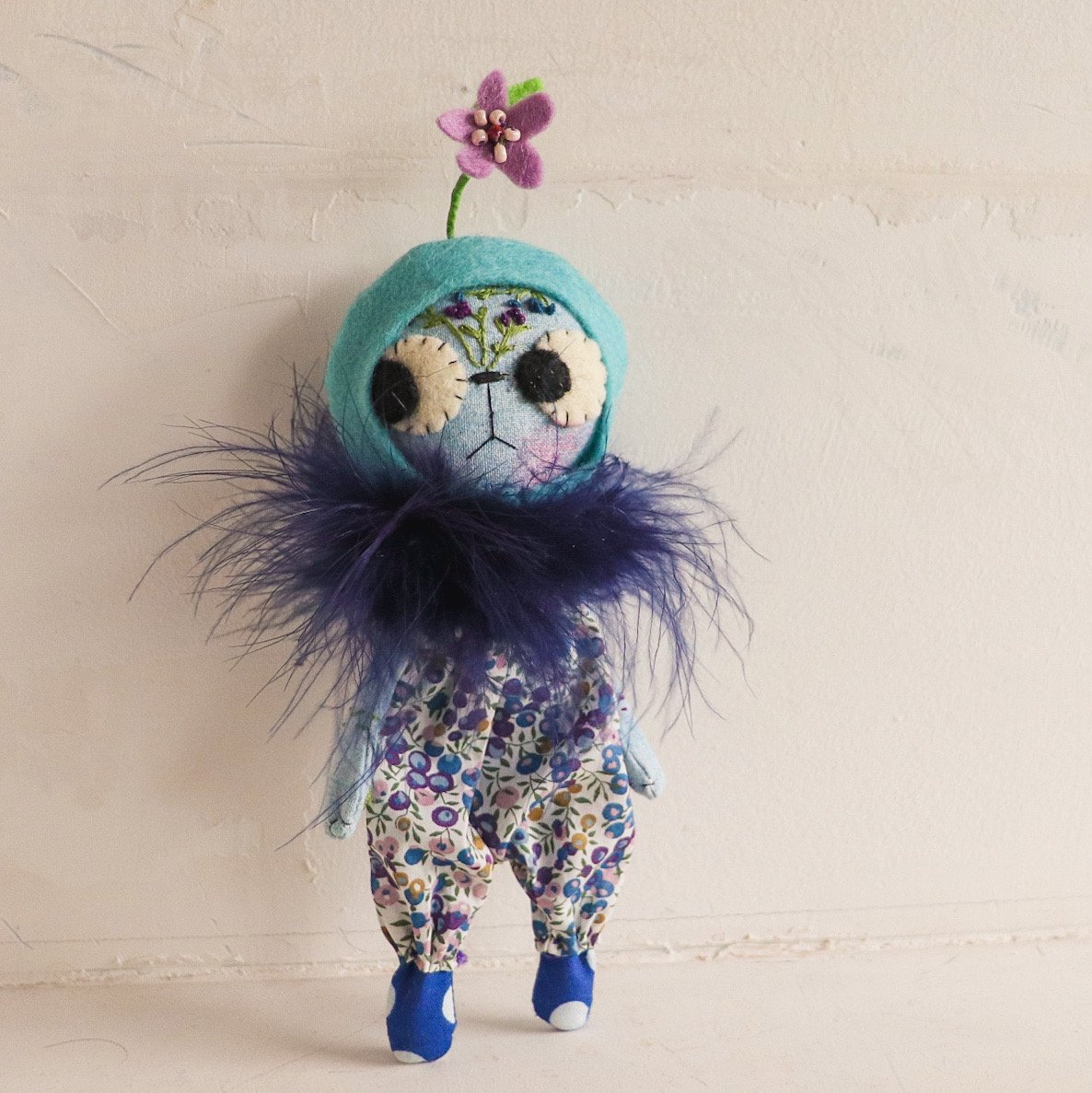 Little Alice is a 7" tiny doll made from Japanese shot cotton with hand-embroidered details. Her clothes are removable. Her legs are made from cotton. She wears a Liberty Lawn cotton romper and a navy blue feather boa, and a wool felt hat with a glass-beaded flower attached.