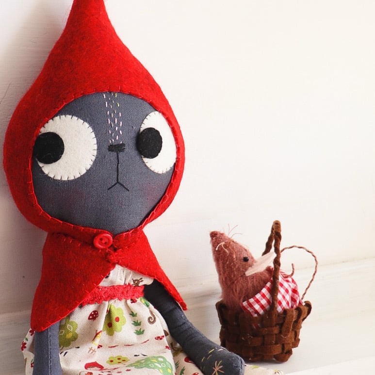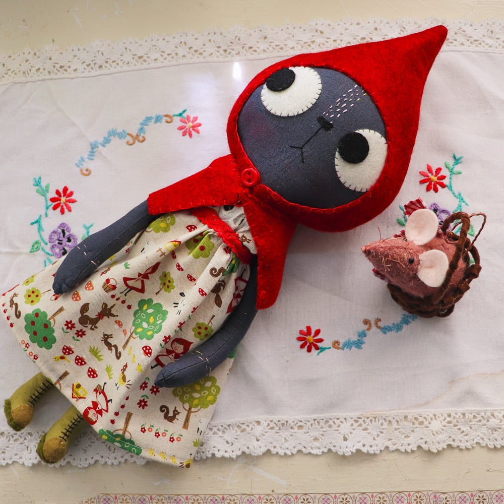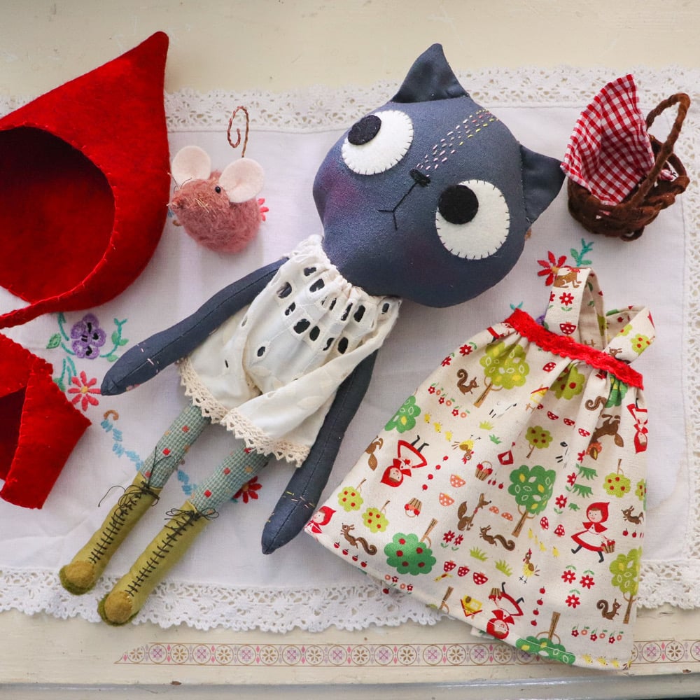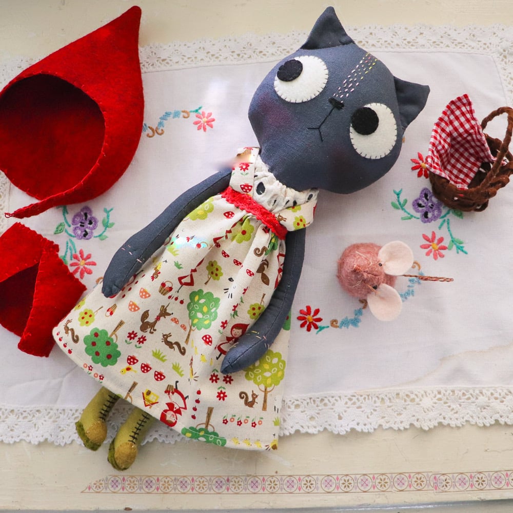 Little Red is a slate grey linen cat with wool felt eyes and hand embroidered details. She has a pinafore in printed linen with japanese woven cotton legs, and a wool felt cape and a petticoat in madeira lace. Little Red has linen and wool felt boots laced with waxed linen thread. The boots cannot be removed.
