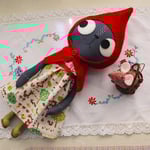 Little Red has a little wool felt bag in the shape of a basket with a check picnic blanket, with a teddy fur mouse inside. The mouse , Plum Pie Pip, has a wire tail wrapped with embroidery floss and glass eyes.