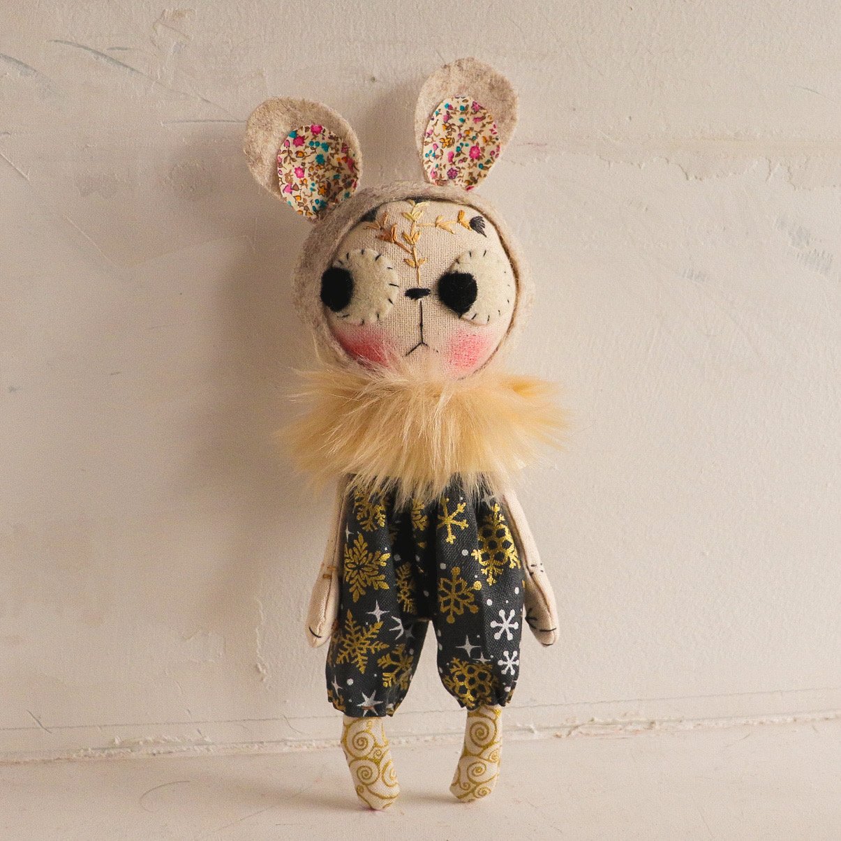 Little Suzy is a 7" tiny doll made from calico cotton with hand-embroidered details. Her clothes are removable. Her legs are made from gold-foiled cotton. She wears a printed cotton romper, a cream faux-fur wrap and a wool felt hat with mouse ears lined with Liberty fabric.