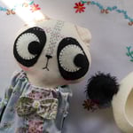 This kitty has a wool-felt panda hat with teddy bear fur panda ears. It is fastened with a hand covered button and a little whirring elastic.