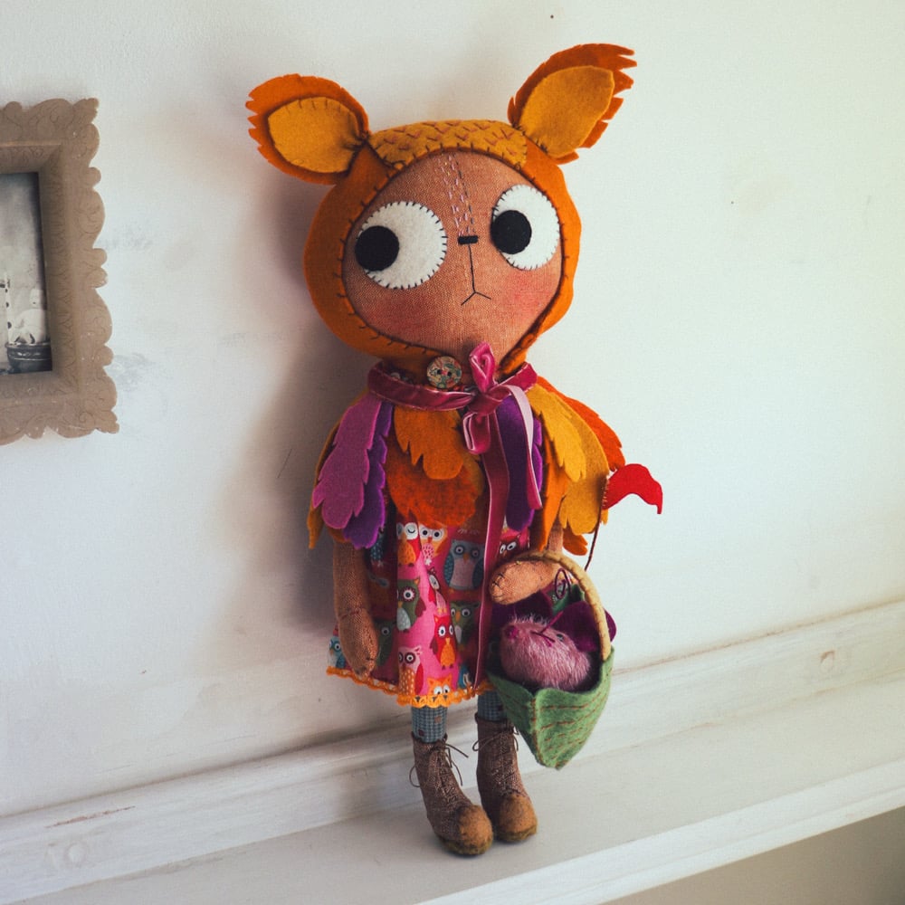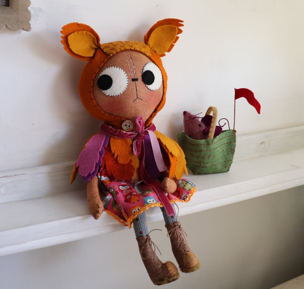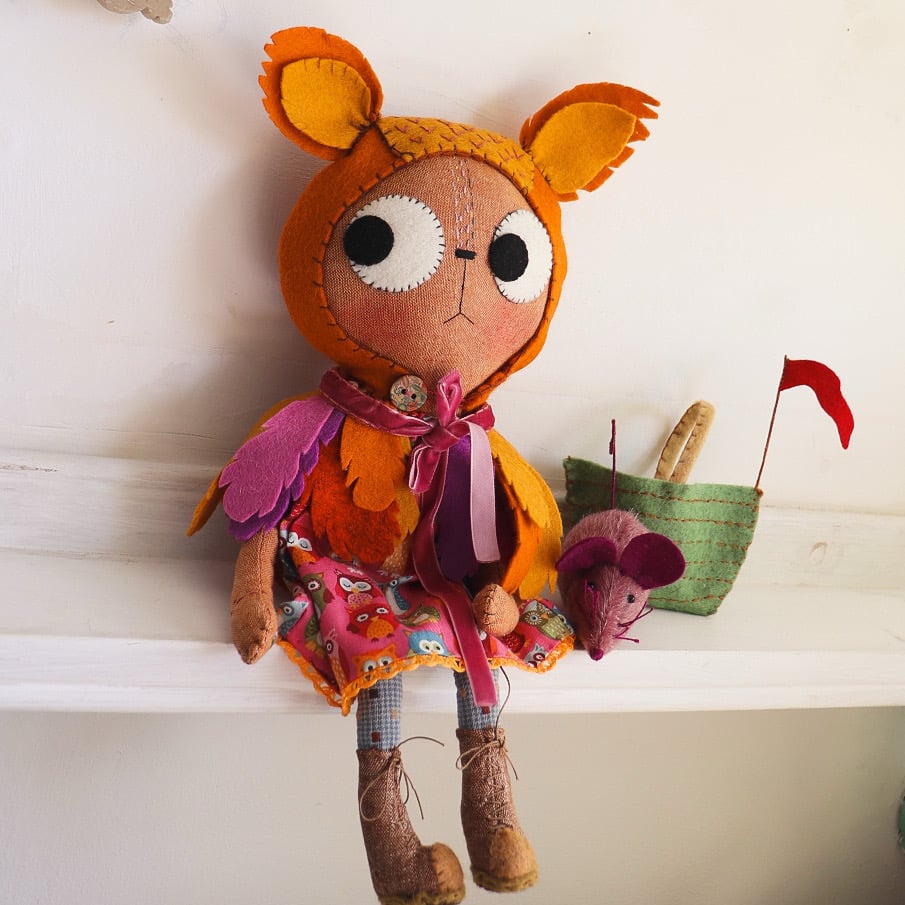Ophelia Owl is an gingerbread linen cat with wool felt eyes and hand embroidered details. She has a dress in owl printed cotton with japanese woven cotton legs, with a wool felt feather cape with velvet ribbon trim. Ophelia has lined and wool felt boots laced with waxed linen thread. The boots cannot be removed.