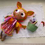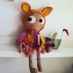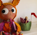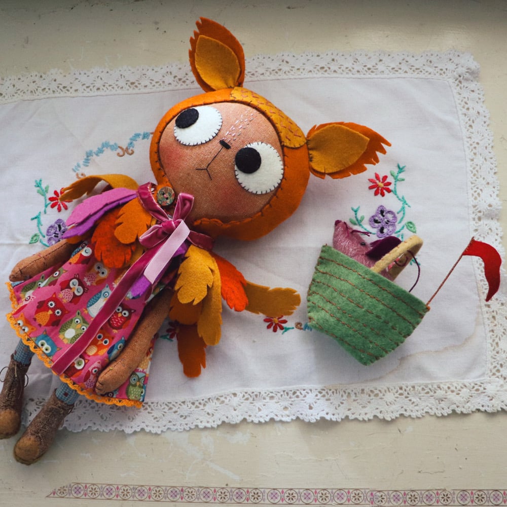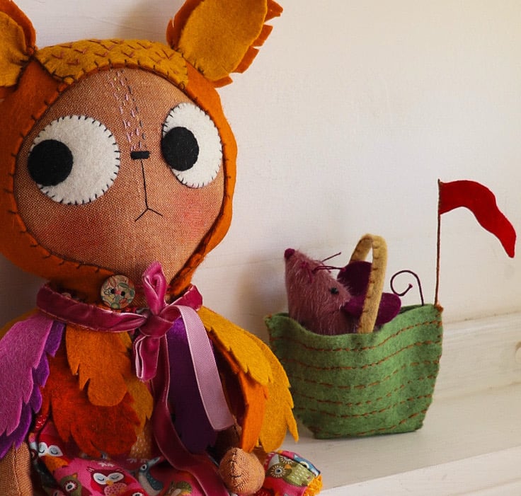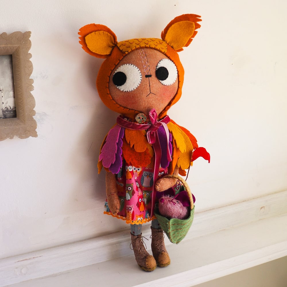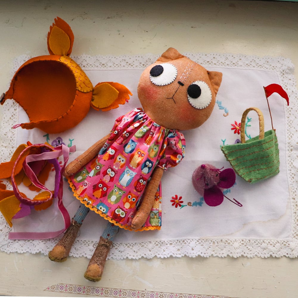 Ophelia Owl is an gingerbread linen cat with wool felt eyes and hand embroidered details. She has a dress in owl printed cotton with japanese woven cotton legs, with a wool felt feather cape with velvet ribbon trim. Ophelia has lined and wool felt boots laced with waxed linen thread. The boots cannot be removed.